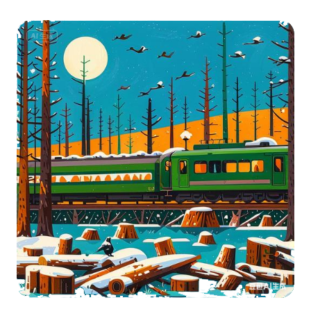 歌词(诗)/望雪等雪听风 AI(图&歌)创作/山坐在那里 一棵树放下年轮的刻度 也放下鸟巢和它的子嗣 天空和大地凸显出来 钢轨锈蚀的肋骨被太阳刷新 火车出现,带着心脏的激动 让停滞的人不由沸腾起来 一群鸟在砍伐后的树桩下盘旋 一只猫,沿着路轨边的栅栏游荡 像一片残雪,随时会消失 绿色车窗锁着千百张,神情不一的脸 有着相同的漂泊和寄存 光呈现的远方,有水的幻象 荒诞而真实 误入歧途,从来不是源自盲目
